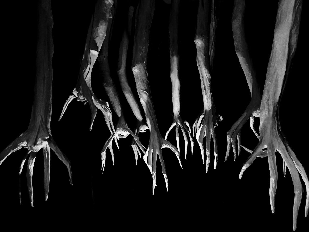 Hands. Hand that morphs, that increase in size and that become distorted. Hands that multiply and take over the room. Hands that dangle. Menacing. Above people and heads. The hands that create, shape and destroy. Arms, faceless, that express fear or love or surprise. Sometimes they also plead for help…are the hands pleading for help? Or is it greed?