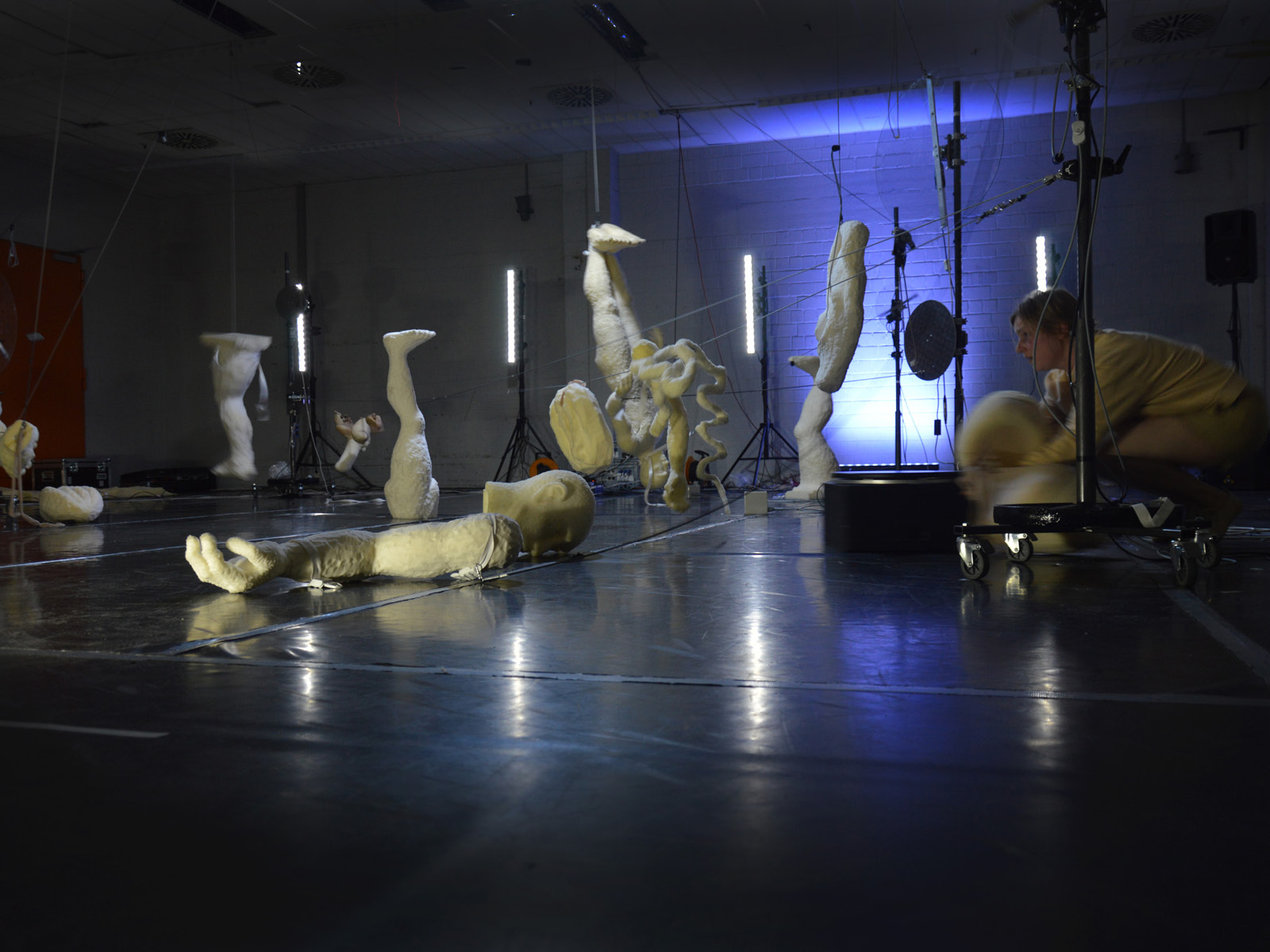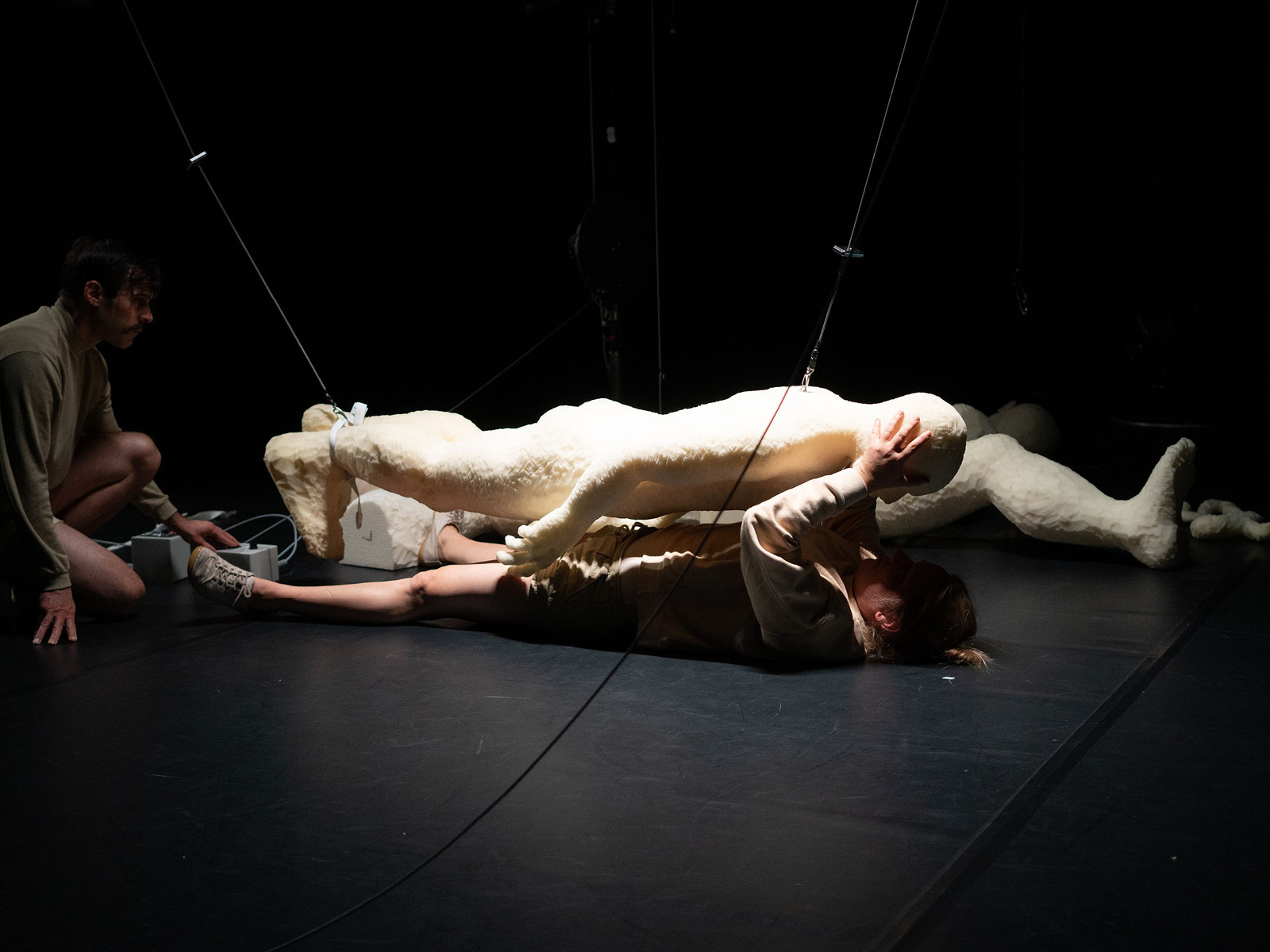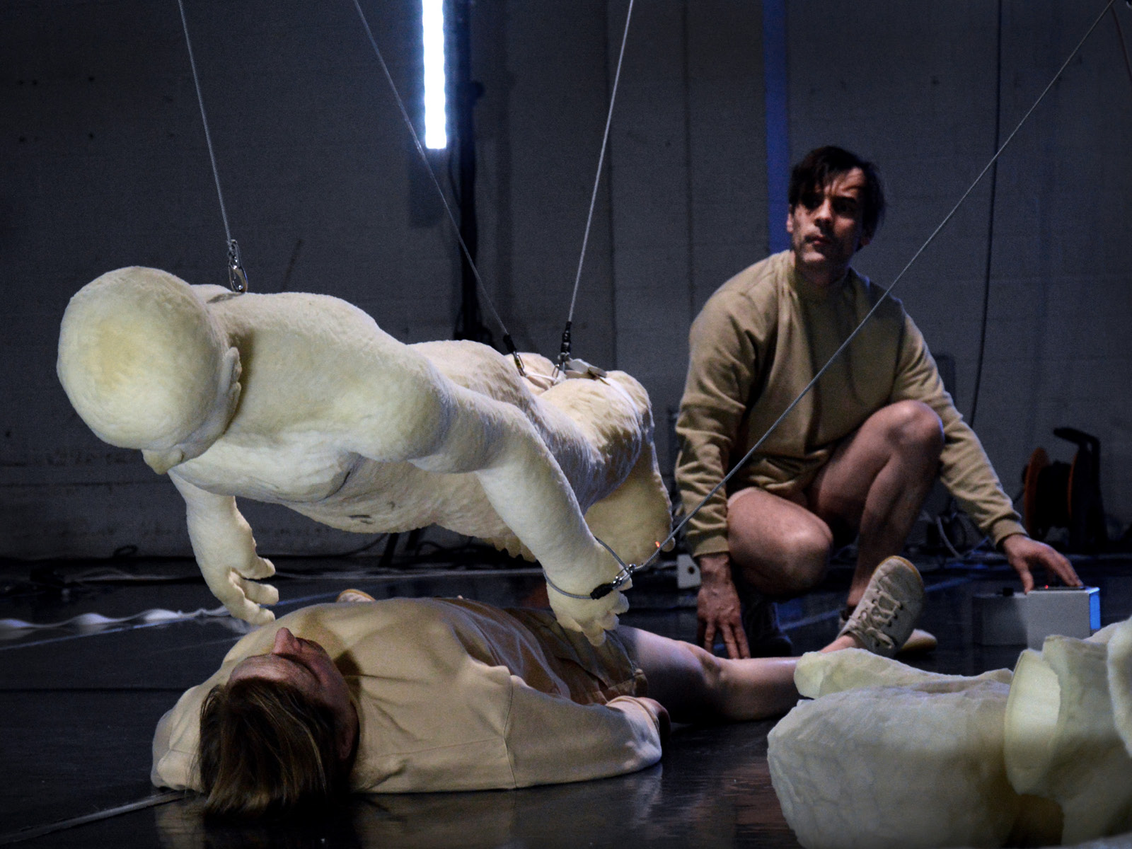»WETWARE« is mechanical dance theatre or musical puppet theatre. »WETWARE« encompasses a poetic approach to the emotional life of the techno-self – it plays with opposites and dependencies between love and death, the precision of machines and the feeling of humans. Inspired by Paul B. Preciado’s auto-experimental book »Testo Junkie«, the puppet theatre performance put on by O-Team explores the malleability of body and self within the context of technology, drugs, sex and biopolitics. In the same way as a long-form poem, it describes the reinvention of nature, electro-cellular circuits, intimate desires, chemical reactions and the technology of the soul.